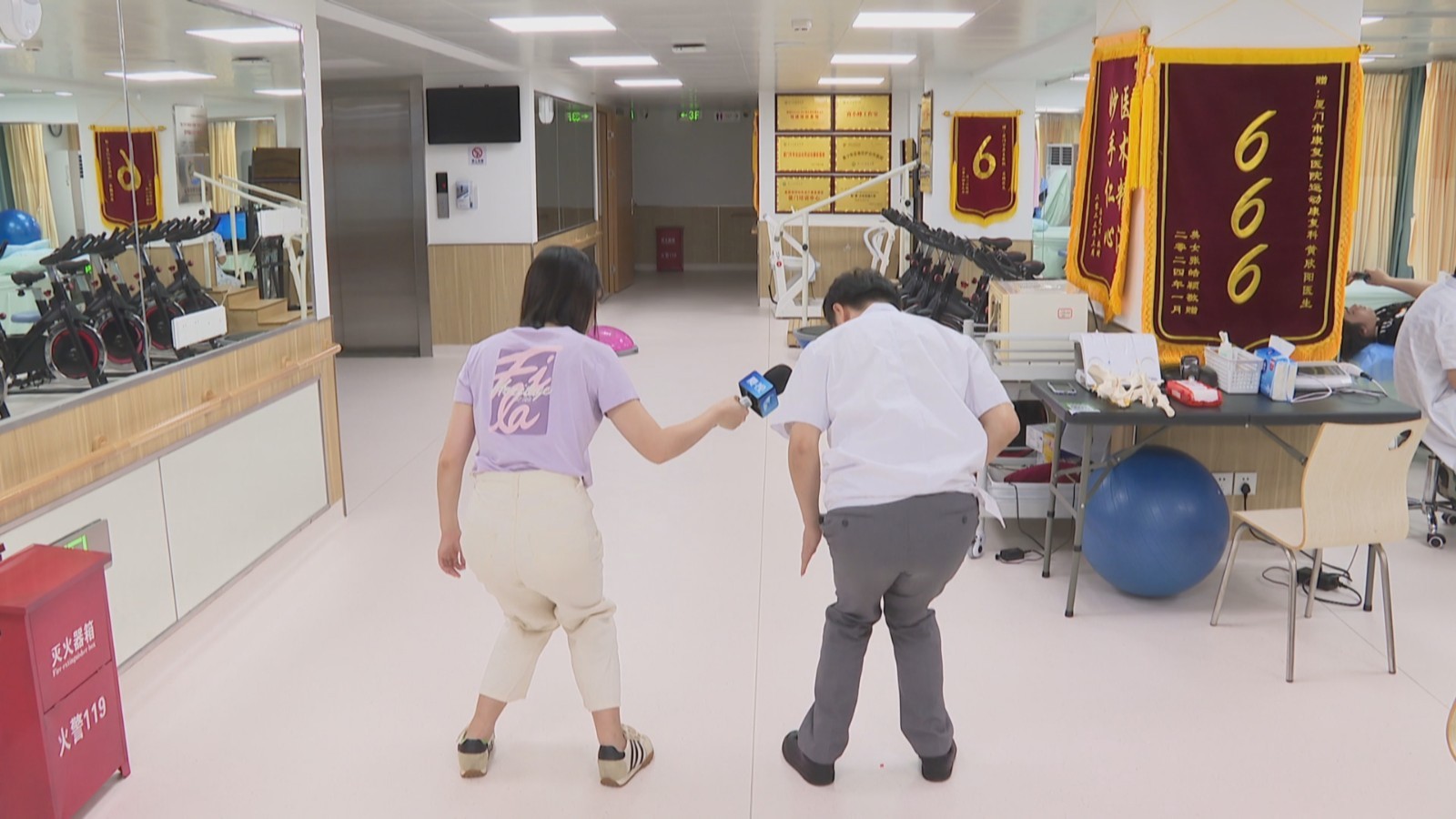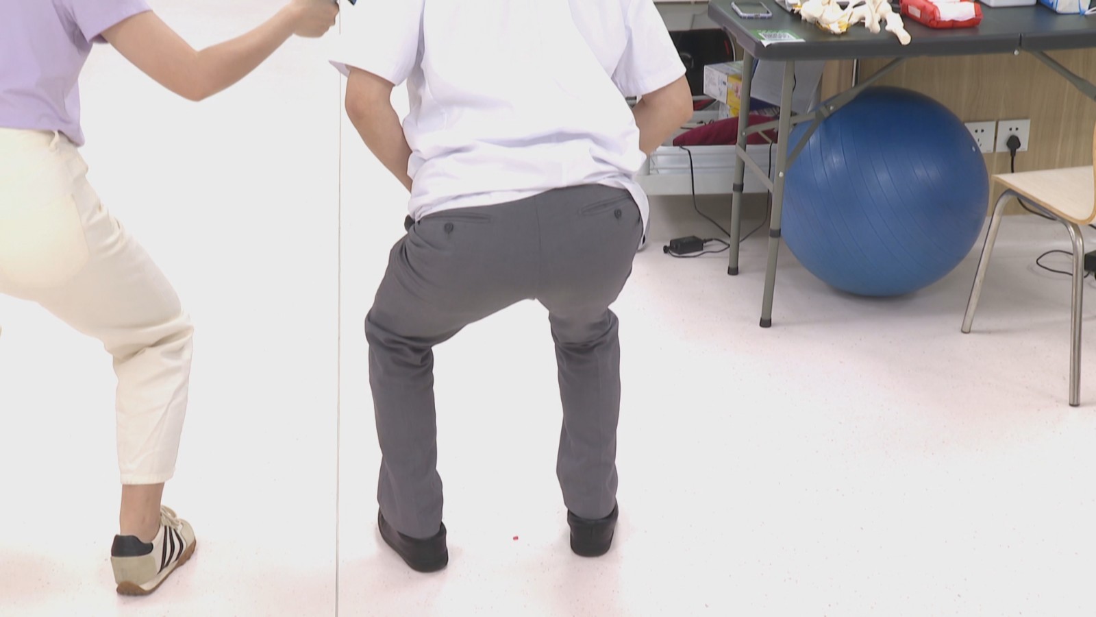 厦门市康复医院运动康复科科室负责人 王学锋:正常我们深蹲的模式是什么样呢?双脚肩宽,髋膝踝是在一个面上。而有“死臀综合征”的人,他臀肌干不来活,他弯腰代替了 ,而下肢没力,靠扣着脚蹲下去的。