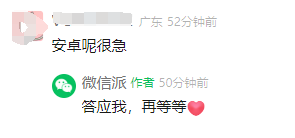 有网友在评论区询问“安卓什么时候可以使用该功能?”微信官方回复称“再等等”。