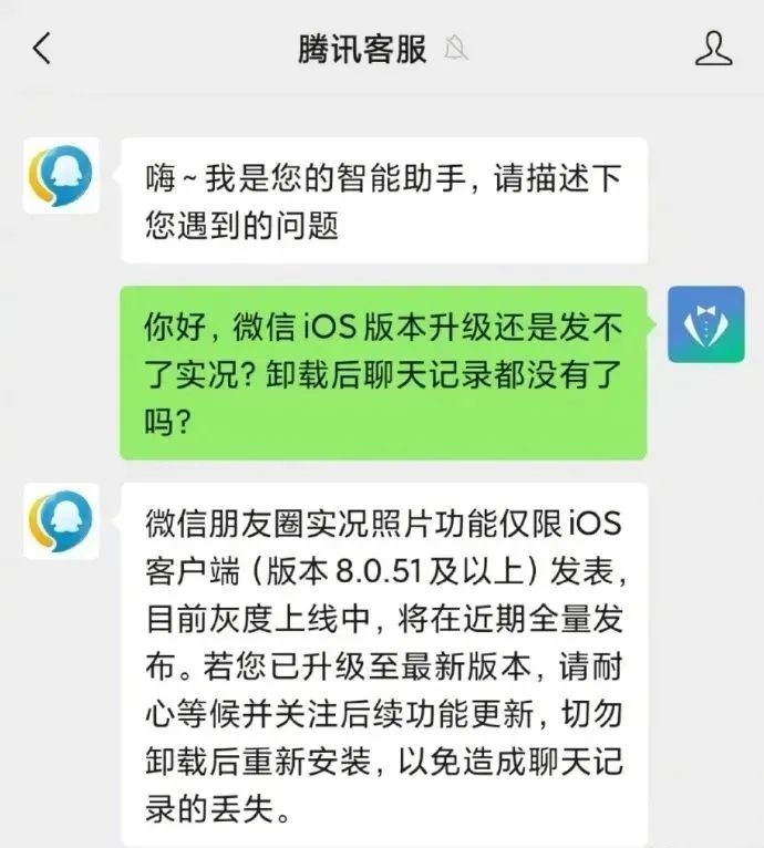 对此,腾讯客服称微信朋友圈实况照片功能仅限iOS客户端(版本8.0.51及以上)发表,目前灰度上线中,将在近期全量发布。若用户已升级至最新版本,请耐心等候并关注后续功能更新,切勿卸载后重新安装,以免造成聊天记录的丢失。