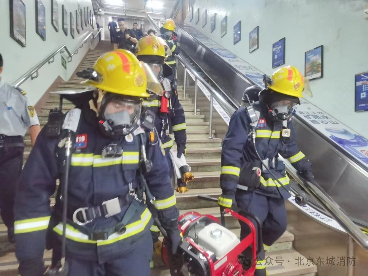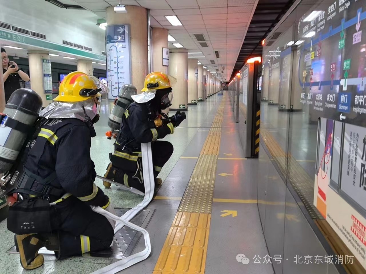 为确保东城区安全度汛,前门消防救援站对地铁2号线C口以及8号线E口开展防汛及消防演练。