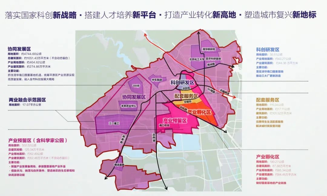 作为全市首批两业融合示范园区,清华南口国重基地将推动先进制造业与现代服务业在园区深度融合,为国家科技创新战略服务,建设人才培养新平台、产业转化新高地、城市复兴新地标。为推动校产城融合发展,我区在清华南口国重基地周边规划建设配套服务区、产业孵化区、产业预留区、协同发展区等4个区域,合理布局“产、居、服、商、游”功能板块,提供多元化生产生活生态空间,提升区域吸引力和承载力。