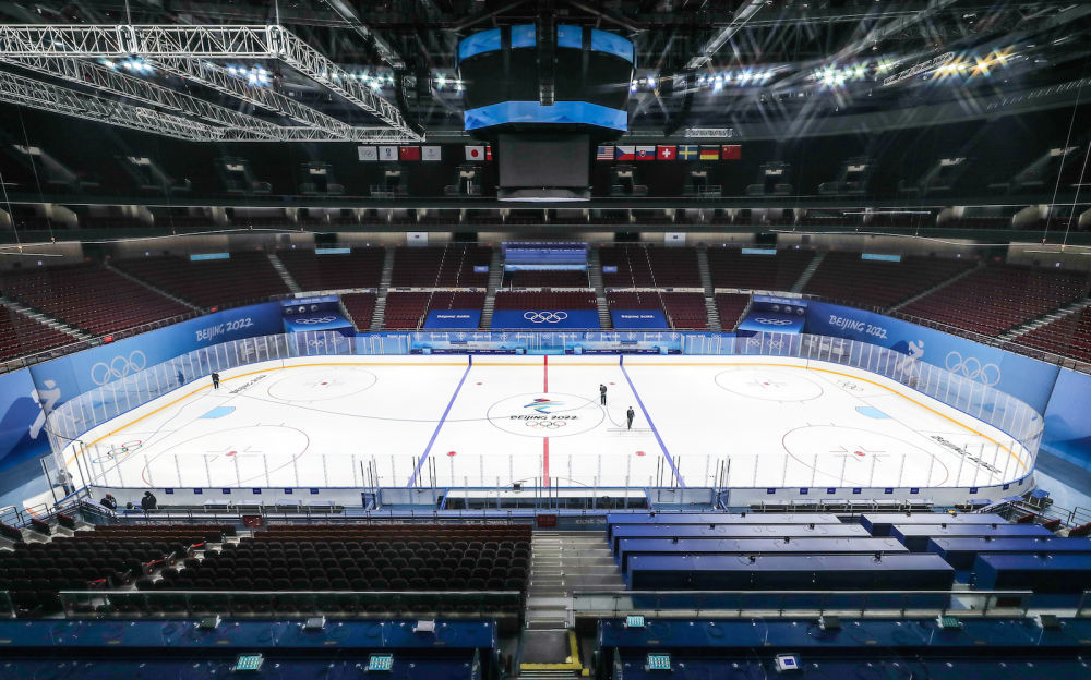 14日,北京冬奥会冰球场馆五棵松体育中心完成冰球标志、标线和冬奥会LOGO铺设。此后,制冰工作进入冰层加厚阶段。