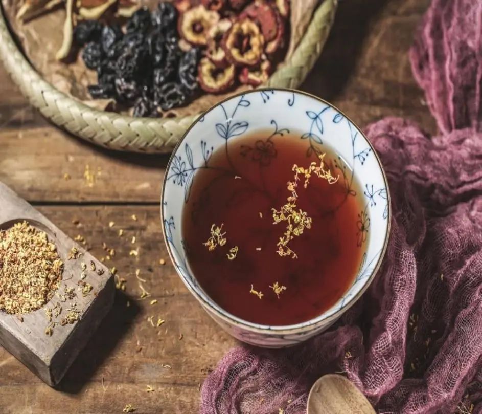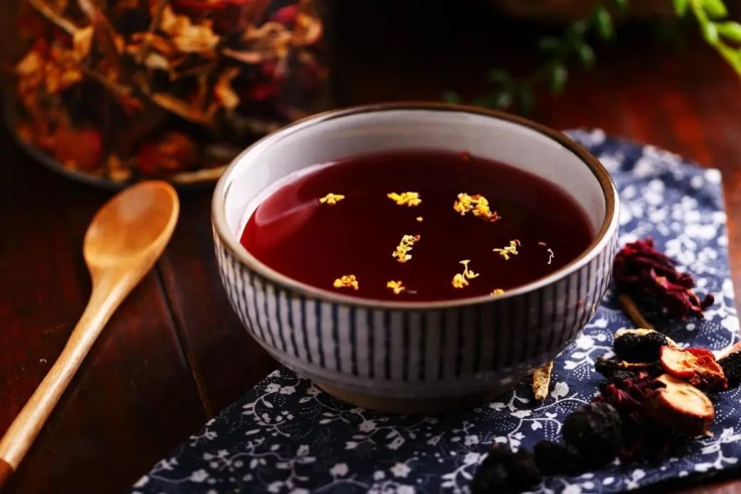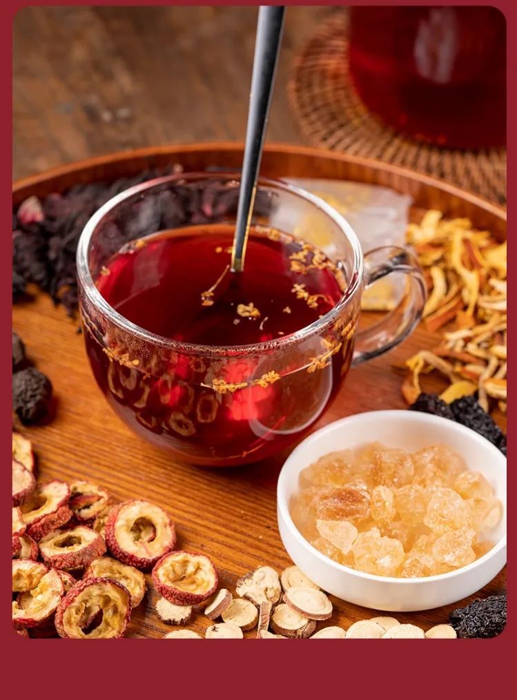 【食材】:乌梅25g、山楂10g、桑葚10g、陈皮6g、洛神花5g、甘草5g、薄荷1g、冰糖适量、桂花3g