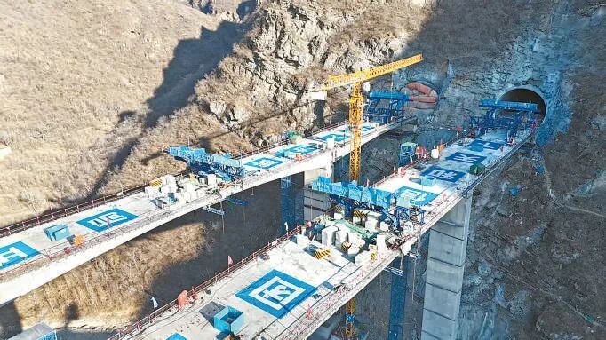 河东村隧道西出口的峭壁旁,便是刚刚合龙的东庄子大桥。这座大桥横跨白石沟,全长518米,主桥采用T型刚构设计,主跨达到70米、主墩高度超30米。而引桥要跨越现有的国道108线和正在建设中的国道108三期。施工过程中,东庄子大桥面临汛期降雨、冬期低温、森林防火期管控、高处作业风险等多重考验。为此,项目团队科学制定工期计划,利用有限的作业时间,采用三班倒、提前开展混凝土的升温保湿措施等,推动4个主墩同时施工,实现平均8天一个节段的高效施工节奏。