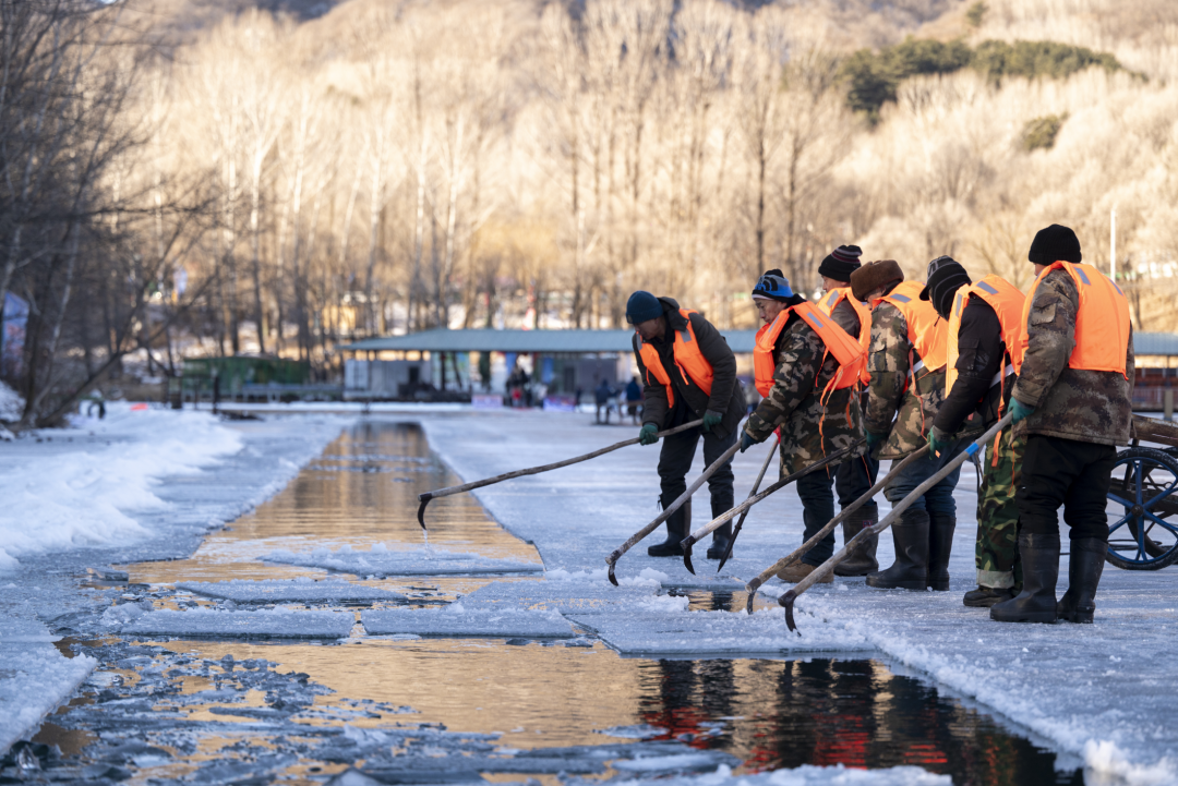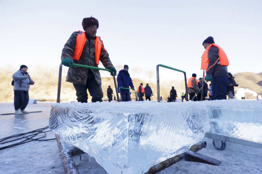 忘忧湖冰面上,数十名采冰工人有序展开作业。电锯轰鸣,刃口飞快旋入冰层,剖开坚厚的湖冰,冰屑如雾纷扬。工人们将冰切割成规格统一的方块,随后,几人协作,以铁钩将浮冰拖出水面,缓缓推至简易滑道前。这些晶莹的冰块经由传送装置运至车上,通过运输车将所采冰块运往龙庆峡,用于制作第40届冰灯艺术节的各类冰雕作品。