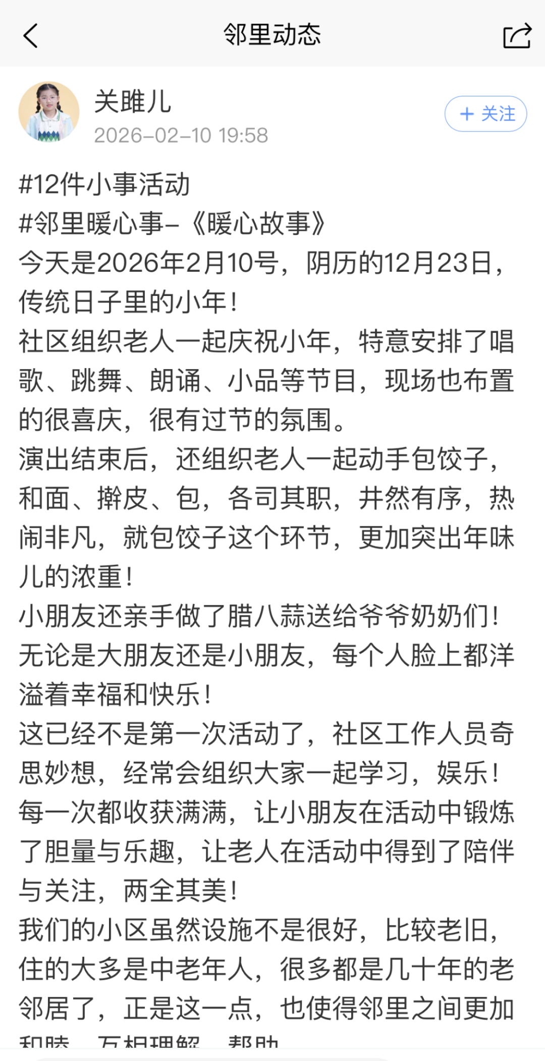在双桥铁路社区,关雎儿则通过邻里圈分享了自己参与社区小年活动的经历,用真挚的文字记录下那份浓浓的邻里情。从送“福”到分享,孩子们用行动和文字,书写着属于这个冬天的温暖故事。通过一次次有温度的实践,孩子们在劳动中体会付出,在服务中感受责任。