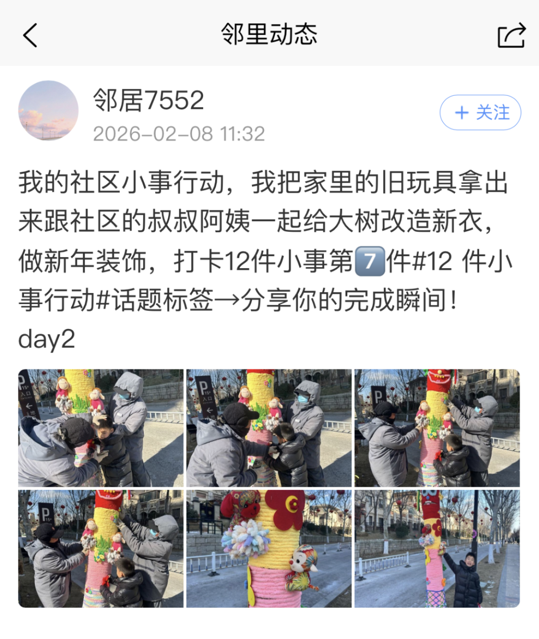 “清理楼道堆物堆料”“学习春节防诈骗知识”“绘制社区趣味导览图”“手写春联送给户外工作者”……寒假期间,三间房新家园APP围绕劳动迎新春、安全小卫士、创意美家园、低碳智慧家、文化传承人、邻里暖心事六大主题,推出了“12件社区小事行动”线上打卡活动。