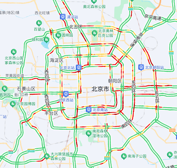 早高峰期间,城区主要环路部分路段,莲石东路、西直门北大街、菜户营南路等联络线进城方向,京藏、京开、京承、京新等主要高速公路进京方向部分路段车流集中。西便门、劲松、航天桥等区域交通压力较大。