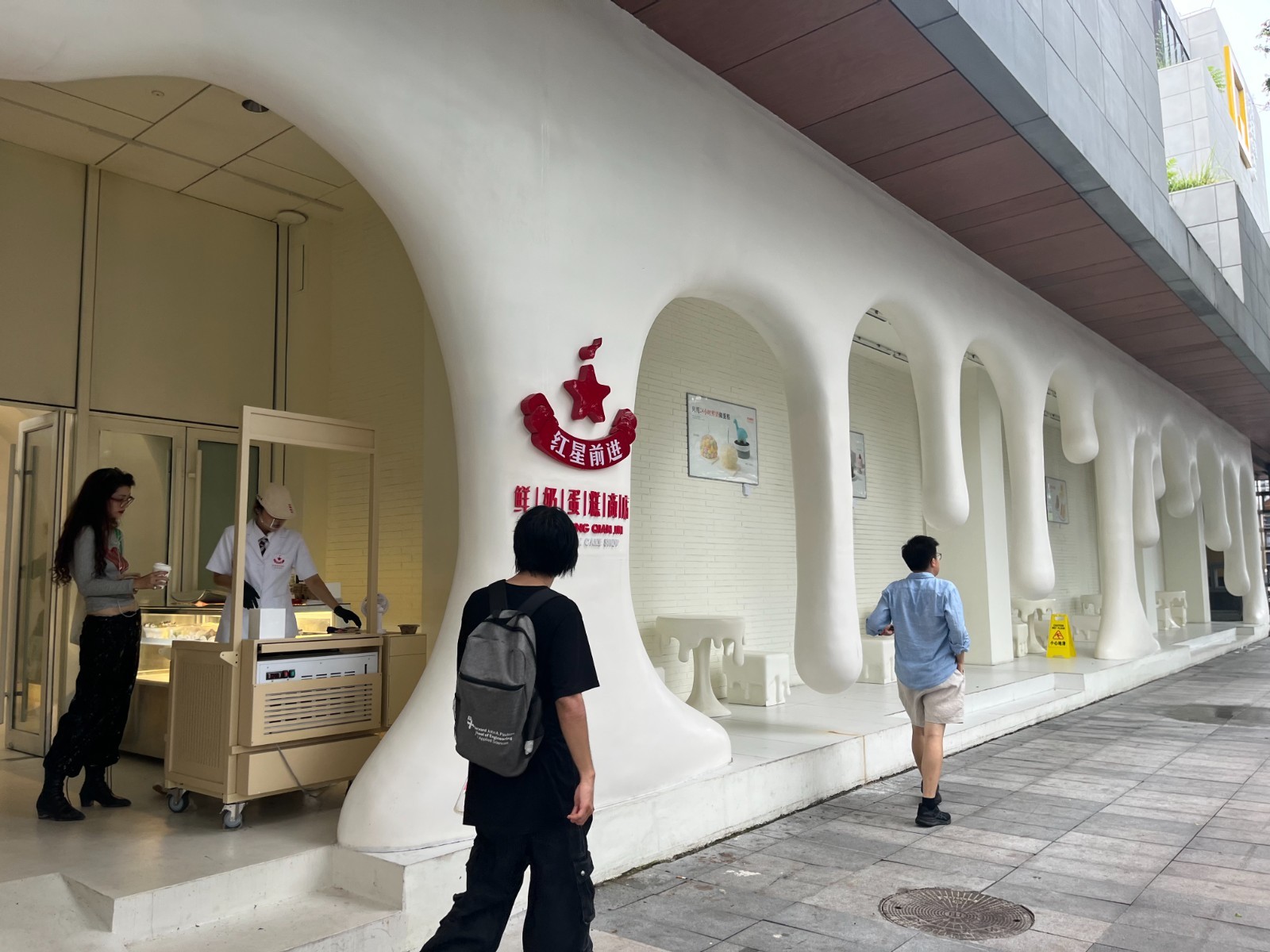 同为文化消费新地标,东城区隆福寺商圈将古老底蕴与现代商业相结合,通过培育融合消费场景,引入了一批首店、旗舰店、创新概念店。街区里,一家屋檐垂落着巨大白色奶油滴的店铺格外醒目,这便是今年6月刚入驻隆福寺商圈的红星前进鲜牛奶蛋糕全国首店。