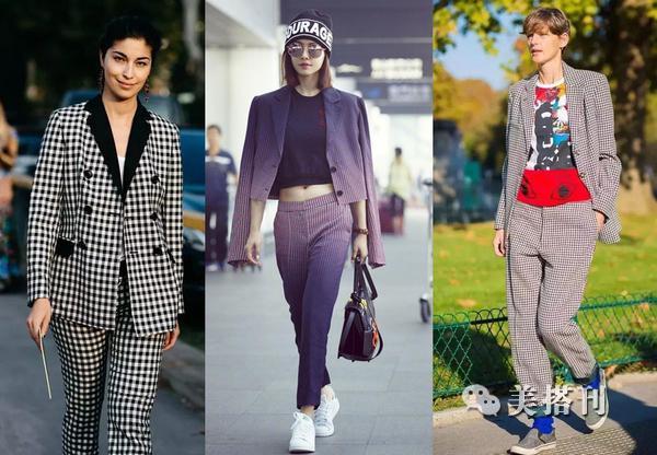 ▲维希格纹的套装,最多的款还是西装+烟管裤。为了避免不要出现严肃、古板的感觉,你可以试试内搭T恤,鞋子推荐搭牛津鞋或乐福鞋。这样就可以有减龄的混搭感。裤子不要太长,最好八九分的长度,露出脚踝更有范,也更显腿部利落。