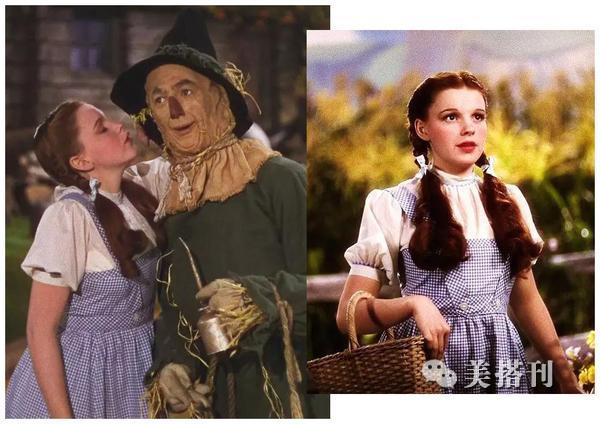 ▲1939年上映的美国童话故事片《绿野仙踪》里,Dorothy Gale的扮演者Judy Garland用用一件白色的泡泡袖搭配了蓝色的维希格背带裙,在电影装扮史中留下了经典的烙印。