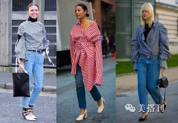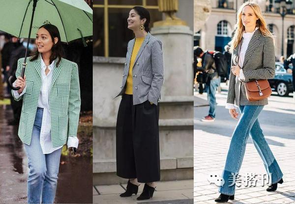 ▲格子图案撞色的配色方案很有视觉冲击力,垫肩外套搭配牛仔裤有种正式和休闲对撞的感觉,充斥着满满的时髦感。搭配一双单色高跟鞋,瞬间打造摩登造型。