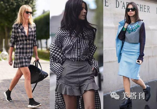 ▲因为格纹属于花纹图案,所以搭配方案就遵循“上花则下简,下花则上简”的原则,格纹裙子搭配纯色的、款式不要太复杂的上衣,基本不会出错。