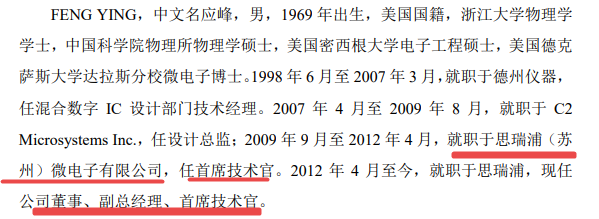 同样,思瑞浦有限创始投资人、现任董事、副总经理、首席技术官应峰在2009年9月至2012年4月任苏州思瑞浦首席技术官。