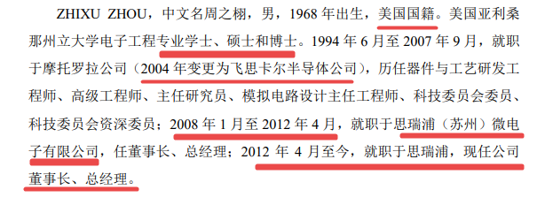 天眼查显示,苏州思瑞浦于2014年11月注销,苏州思瑞浦董事长是章晓军,周之栩是董事兼总经理,而思瑞浦招股书上会稿显示,周之栩先生在2008年1月至2012年4月,担任思瑞浦(苏州)微电子有限公司职务是董事长、总经理。