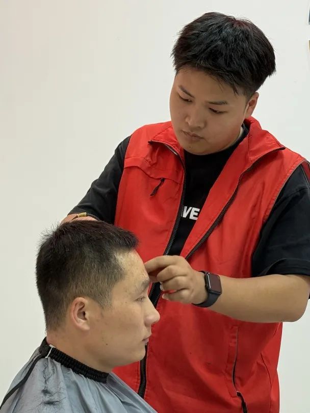 “你是想留短寸还是稍微长一点的发型呀?”手艺在线的“托尼”老师带着专业理发工具早早到现场等候,耐心询问骑手们的需求,根据每位骑手的需求和脸型设计合适的发型。