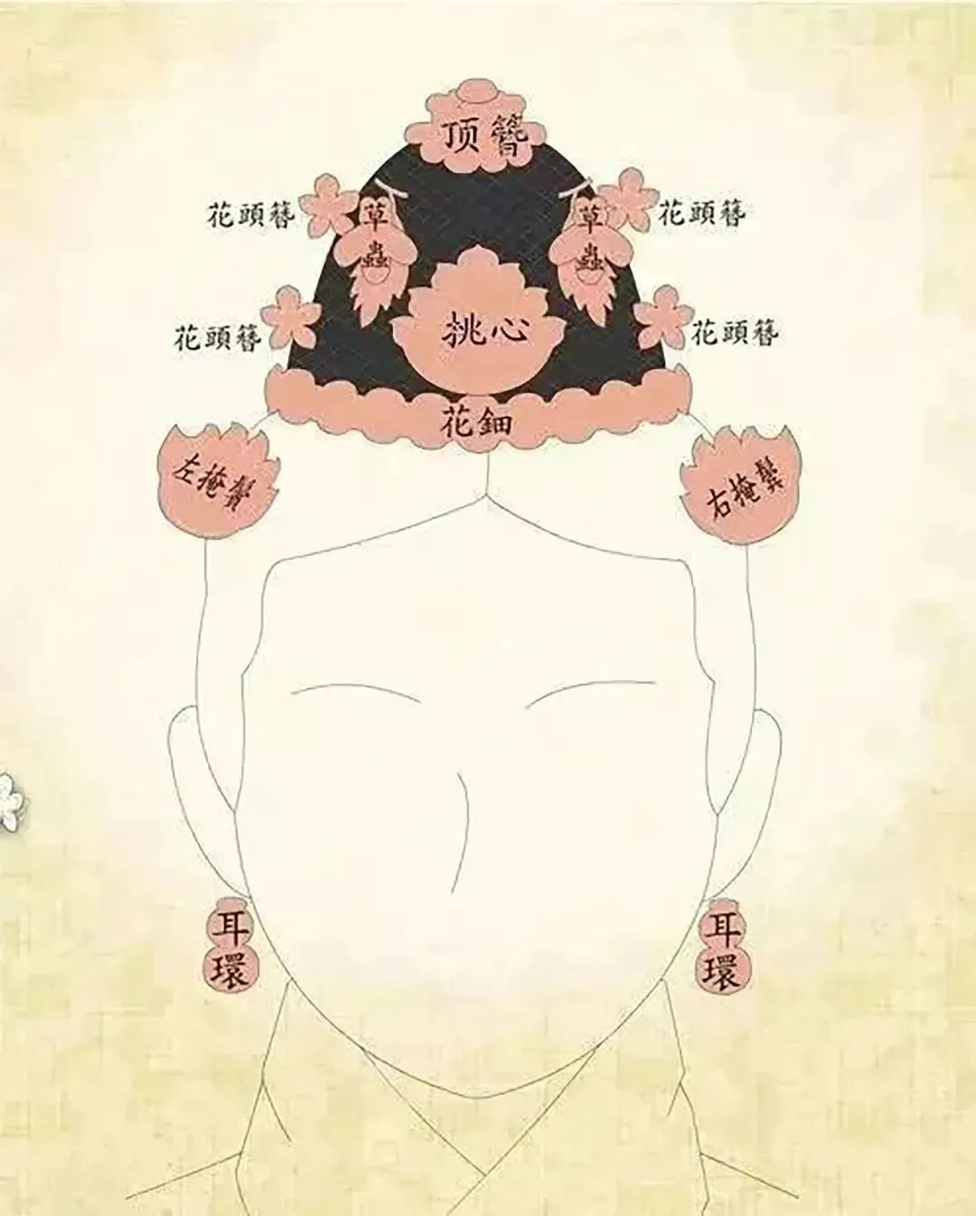 在䯼髻周围佩戴,同一系列、主题的发簪和发钗,掩鬓、花钿、挑心、分心、顶簪等,数量常在10~13件。