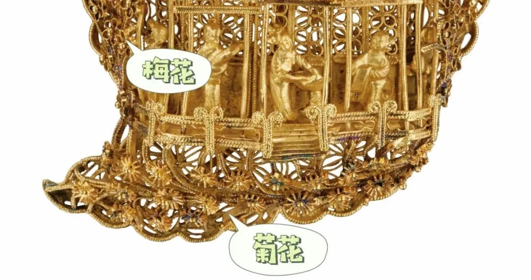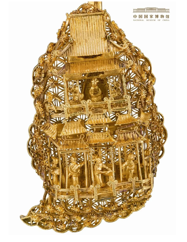 这支发簪之所以如此华美,秘诀在于高超的累丝工艺,也就是将金料拉成极细的金丝,再由明代的“建模大师”编织成各式花纹,焊接在簪子上,制造出的簪首“重工”又不失轻巧。