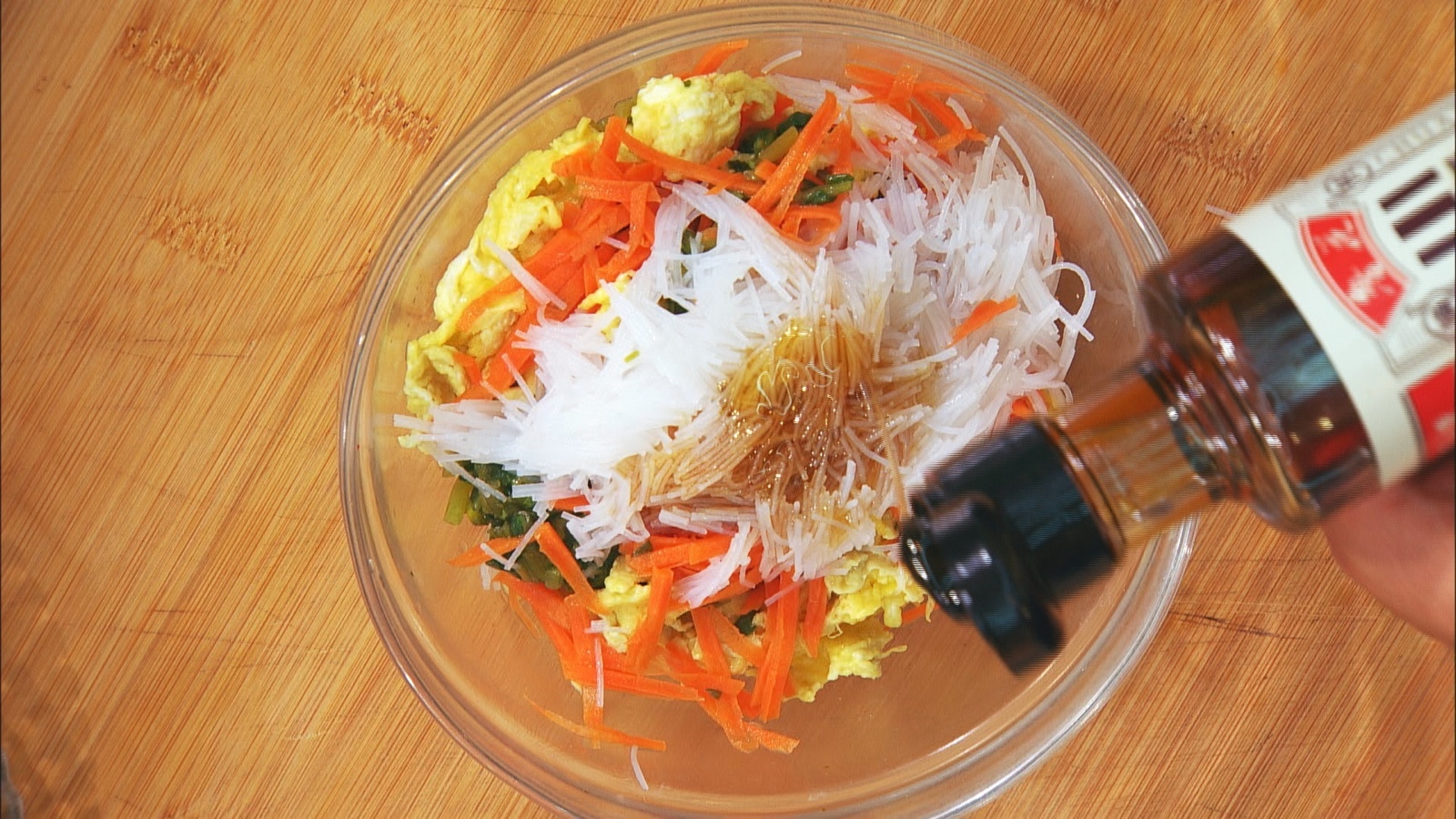 步骤1:鸡蛋炒熟,放入焯过水的胡萝卜、粉丝、马齿苋,加入酱油、盐、香油调味;