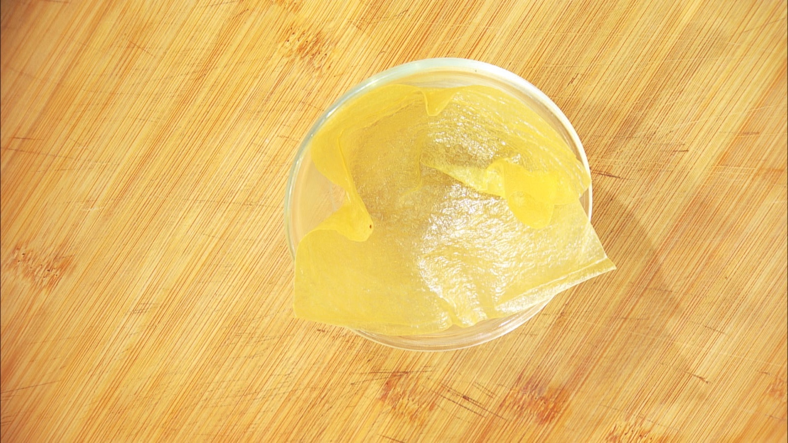 步骤2:干油豆皮切方片,放入小碗,加入馅料包起来后,用腐皮丝系紧;
