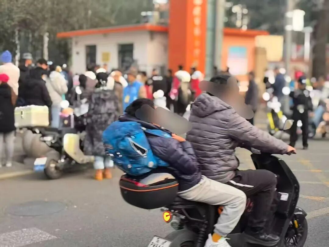 随着校门打开,老师领着学生走出校门,家长一窝蜂地涌上前去,寻找自家的孩子。瞬时间,人流车流混杂,鸣笛声不绝于耳,混乱的人群里还夹杂着外卖车辆。不到10分钟时间,就有超过50辆载着孩子的电动车从记者面前经过。但无一例外,这些电动车上的家长和孩子都没有戴头盔。