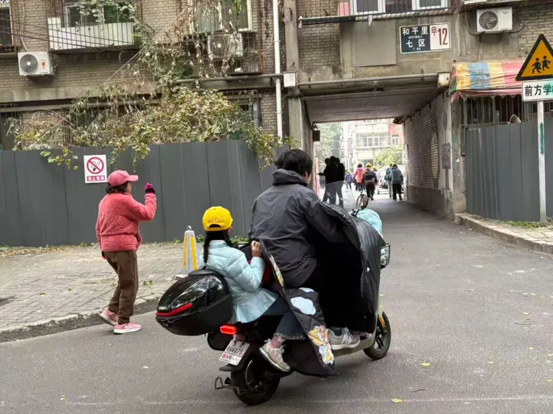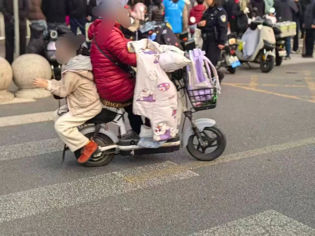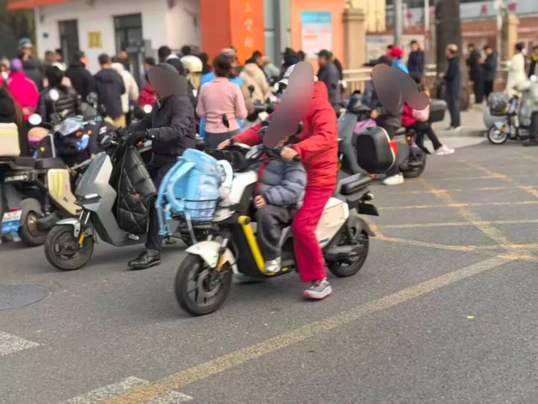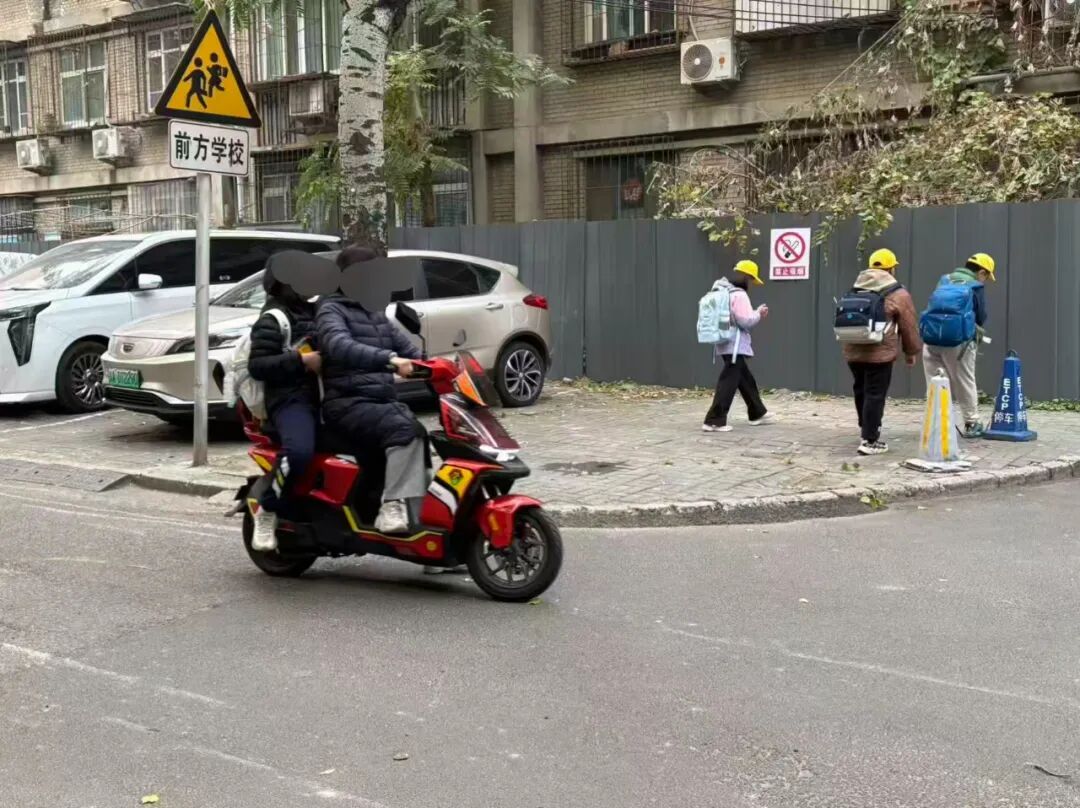 此外,还有几名家长在电动车踏板上加装了“小凳子”,骑行时就把孩子卡在自己的双腿间,而没有其他防护措施。更令人担心的是,从学校出来向南有一个十字路口,有几名家长带着孩子,在道路上逆行掉头,不等绿灯亮起就骑车直接闯过了路口。