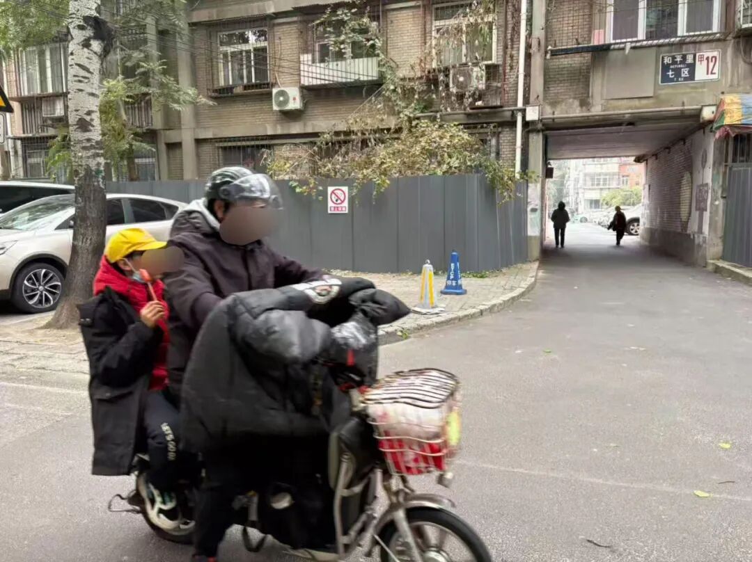 东城区和平里第九小学周边老式居民楼较多,通往学校的道路相对狭窄。早上7时30分左右,不少家长都是骑着电动车送孩子上学。在通往学校的路口处,记者看到不少家长和孩子都没有戴头盔。