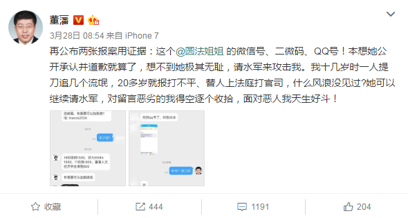 28日早晨8时左右,董藩发博称找到报案证据,晒出其找到的“姚女士”微信号及聊天截图,并写道“我十几岁时一人提刀追几个流氓,20多岁就报打不平、替人上法庭打官司,什么风浪没见过?她可以继续请水军,对留言恶劣的我得空逐个收拾,面对恶人我天生好斗!”