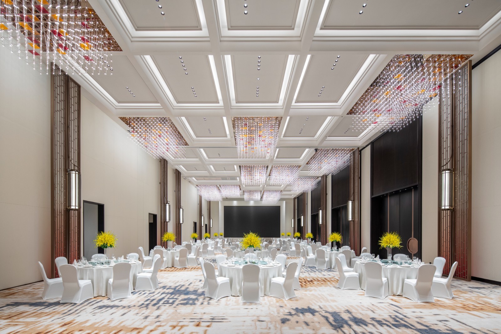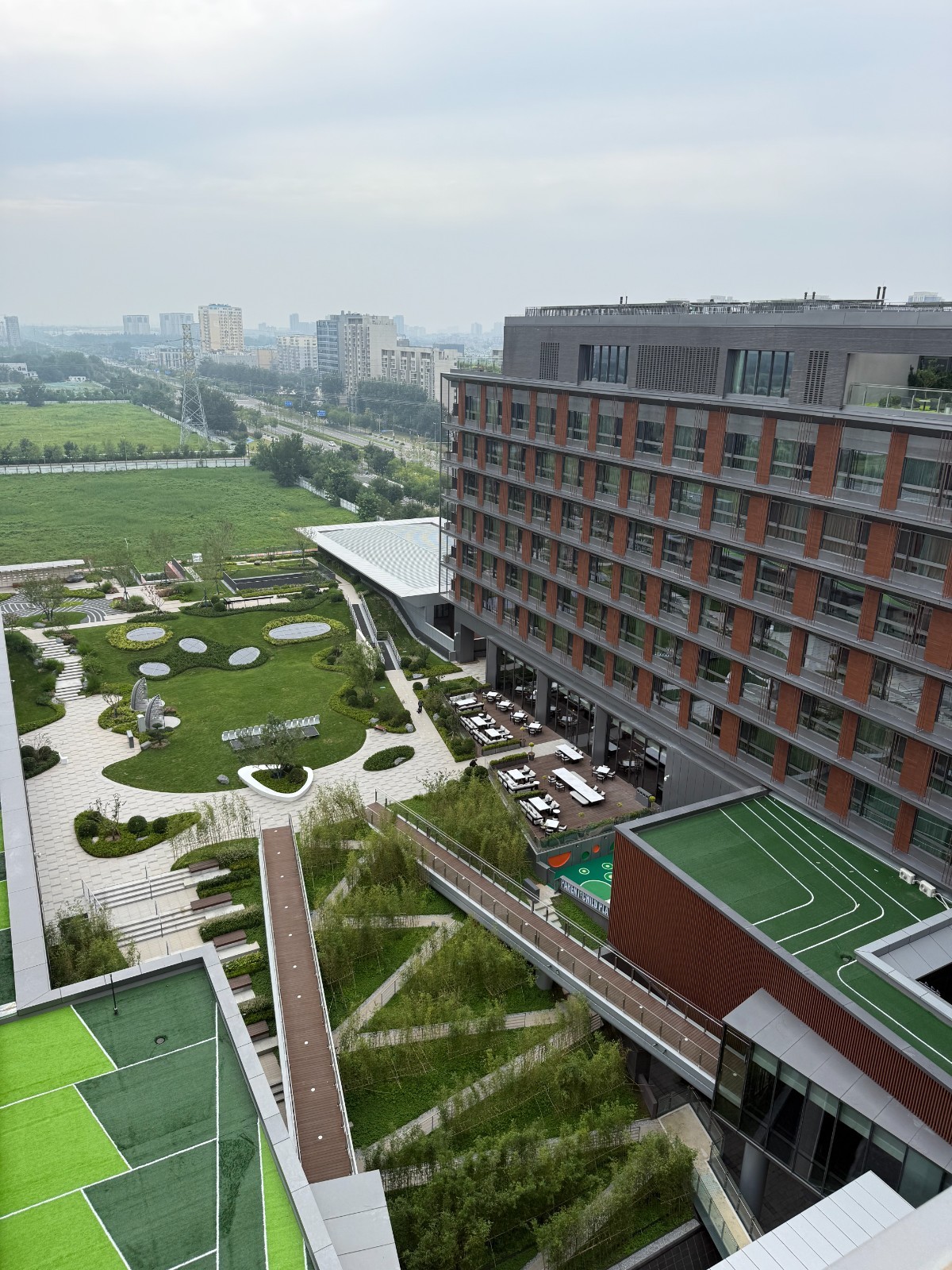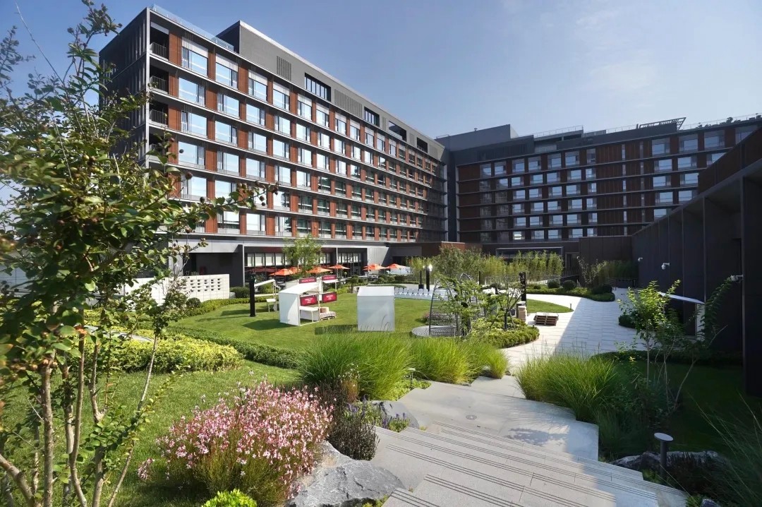 酒店建筑外观透过几何形态玻璃幕墙,捕捉动感的城市光影,打造城市花园秘境。内部空间汇聚时尚客房、特色餐厅及屋顶酒吧、健身中心,以及上千平米会议场地和户外花园,艺术品设计灵感来源于宫廷艺术与京城韵味, 作为适配城市副中心“国际交往、高端商务、文旅度假”需求的五星级酒店,将成为副中心文化旅游区高端服务的重要补充。