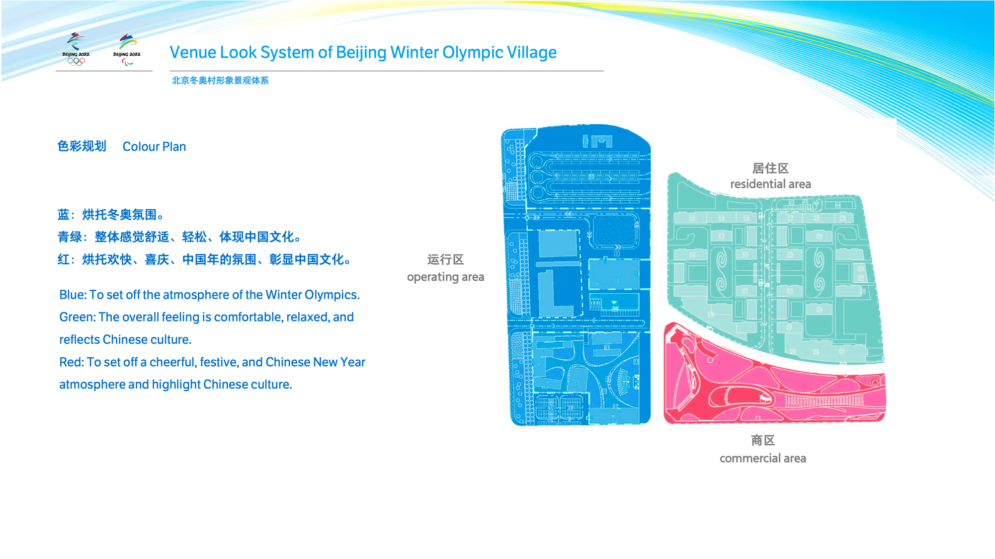 作为北京冬奥村的形象景观经理,张维将冬奥村的三个区域,根据各自的功能,分别进行了不同的色彩设计:运行区主打蓝色,以烘托冬奥的氛围;居住区则以青绿为底,让运动员在感受到中国传统文化的同时也觉得舒适轻松;广场区则是大面积的霞光红,欢快喜庆,彰显中国文化特色。