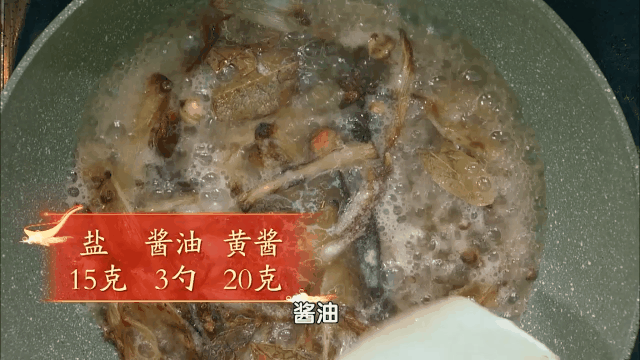 秘制卤料:锅中倒入水放入冰糖,将冰糖炒至酱油色倒入水,放入油、葱姜、香叶、大料、小茴香、豆蔻、花椒、白芷以及桂皮翻炒一会,然后加入15克盐、3勺酱油以及20克黄酱。