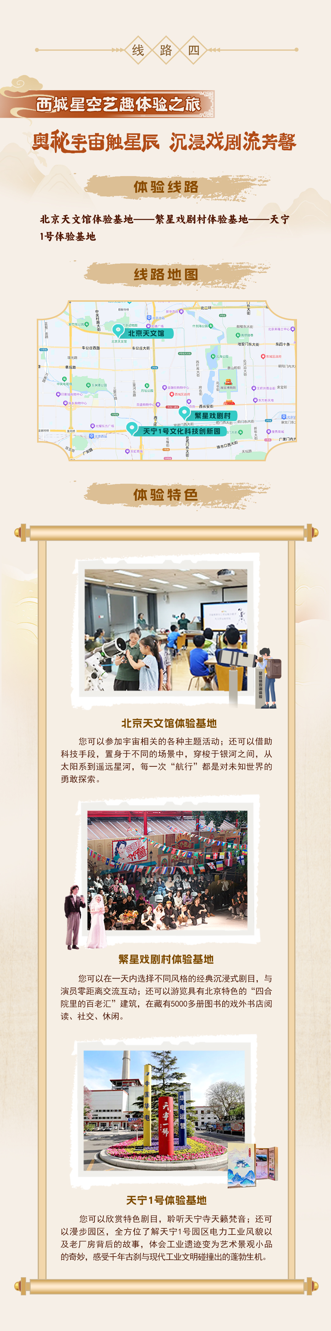 来东城赴一场京味儿之旅,体验木作、点蓝等非遗技艺,穿戴京剧服装道具,观摩戏曲演员化妆,在仿古的胡同街道体验拉洋片;漫步西城的胡同小道,喝“老二分”大碗茶,观看京剧、曲艺等传统表演,学做一双正宗的老北京布鞋,漫步式VR沉浸体验“中轴奇妙夜”、“奇遇山海经”,或欣赏经典沉浸戏剧,打卡具有北京特色的“四合院里的百老汇”建筑;踏入朝阳,观看经典木偶戏演出和体验木偶手工课程,欣赏国内外艺术大师作品展,探秘电影的拍摄流程,体验紫檀雕刻、金漆镶嵌、贴金等传统技艺,感受多元艺术和匠心古韵的魅力;走进海淀,观看京西皮影戏、制作皮影人,聆听一场学术讲座,汲取艺术与智慧的甘泉;到丰台赴一场与花的约定,赏花、栽花、喂鹦鹉、制作园林模型,在千姿百态的园林里享受片刻的宁静。