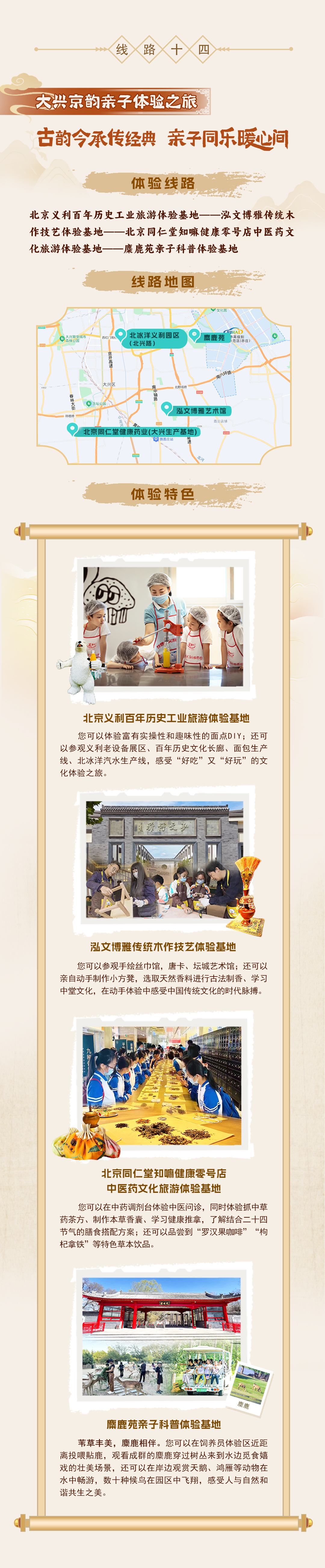 北京义利百年历史工业旅游体验基地——泓文博雅传统木作技艺体验基地——北京同仁堂知嘛健康零号店中医药文化旅游体验基地——麋鹿苑亲子科普体验基地