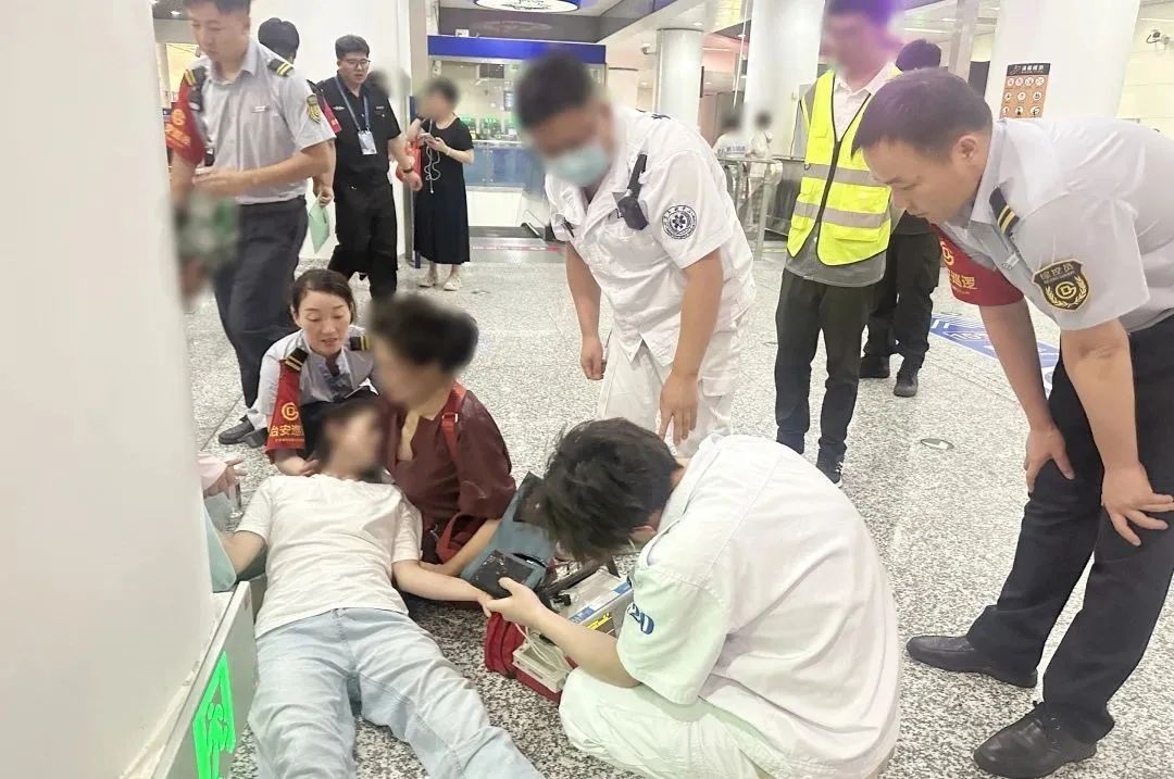 “西厅直梯处有女乘客倒地抽搐!” 7月31日晚约6时30分,接到紧急报告,值班站长梁雪峰迅速赶到地铁15号线奥林匹克公园站站厅。在西厅直梯处,一位约20岁的女乘客呼吸急促且伴有急喘、四肢抽动,正满头是汗地给家人打电话;一位路过的女乘客坐在地上抱着她。“当时我看这位女乘客一直在急喘,上气不接下气的,说话也断断续续。”梁雪峰见状接过电话向家属说明了位置。“我不知道怎么回事,孩子一直很健康。我马上过来,大概一个小时后到。”在电话另一端,患者的家属十分心急,说话已经带着哭腔。放下电话,梁雪峰立即拨打了120急救电话,并通知其他工作人员前来帮忙。站务员葛英萱迅速取来矿泉水,盛艳艳疏散了周围乘客并为女乘客扇风降温,综控员孙京伟则取来AED设备做好准备,同时全站广播寻找医护人员。