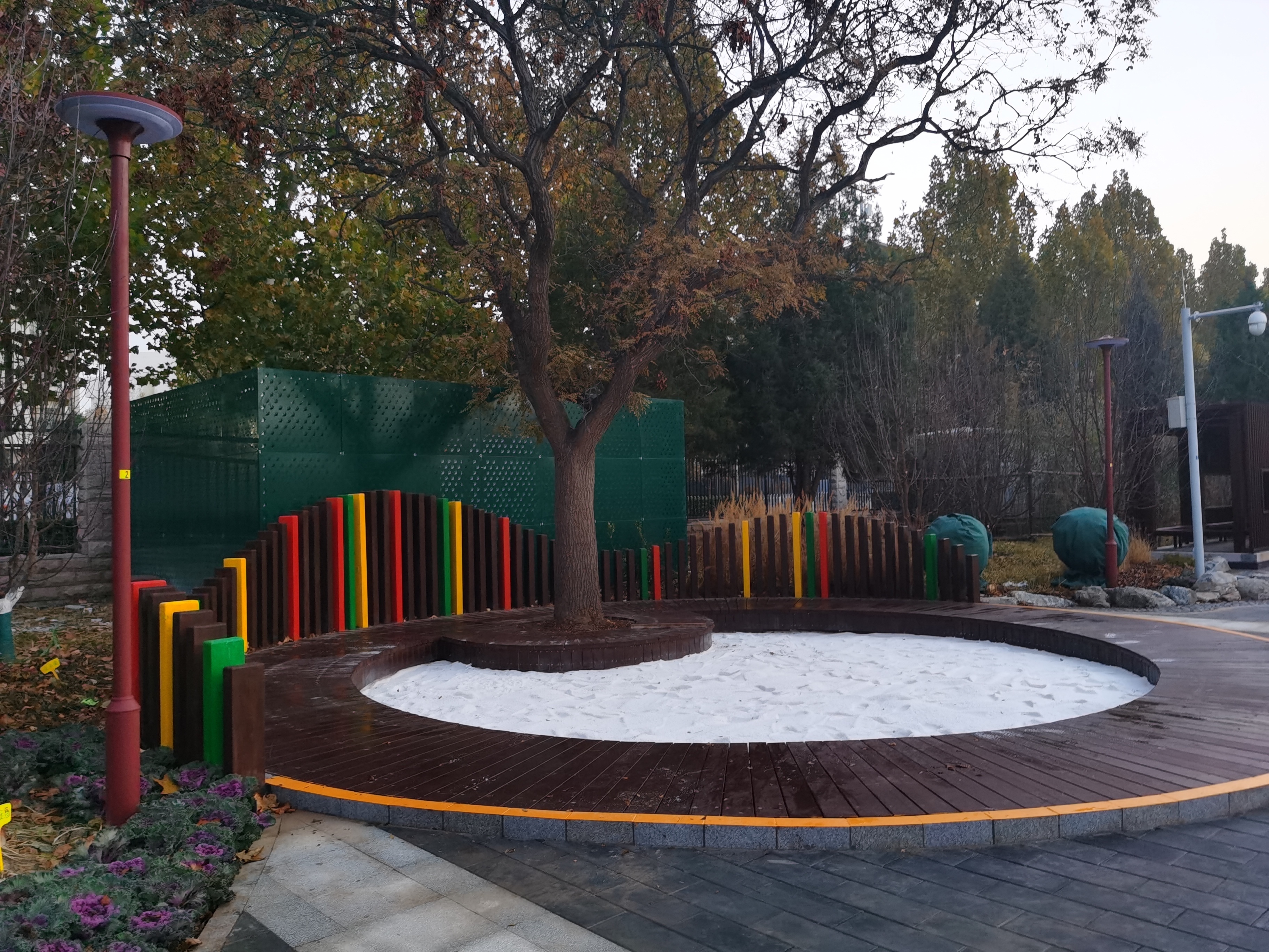三是“健身科普、全龄友好”:形成两大环路:1环湖健步环:保留原有1千米的环湖主路,更新为3米宽的红色沥青路面,提高了游人漫步及慢跑的舒适度,结合两侧的健身设施形成一条特色健步环。2滨水科普环:在原有亲水步道的基础上新建西侧亲水木栈道,以湖面为依托,设置体现多样性动植物的科普宣传牌,形成全园最具亮点的自然生态科普游线。同时注重人性化设计,关注一老一小,满足了不同使用人群的需求,设置儿童游戏沙坑,老人活动廊架,无障碍坡道等设施,体增现了全龄友好型公园的特色。四是“保留利用、低碳节约”:延续原有空间及功能布局,充分尊重保留和利用现有植物2000余株,所有景点均在原有基础上进行改造提升,减少大的调整和改变;同时将施工拆除的毛石废弃物垫于挡墙、道路基础,在营造景观的同时减少渣土外运,通过多种建设手段体现低碳环保的理念。
