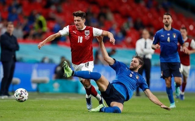 欧洲杯淘汰赛,奥地利球员与洛卡特利(蓝球衣5号)拼抢