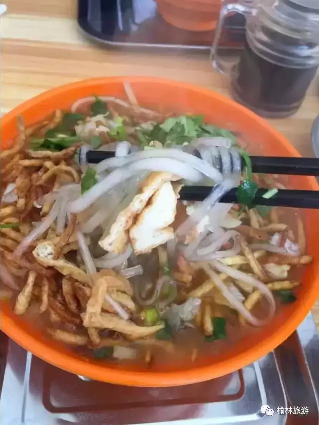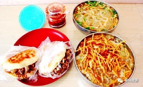 而在定边,因为定边距离榆林城较远,反而离银川比较近,因此受宁夏的影响比较大。做法虽然大同小异,但放入芹菜块儿比较鲜香,而且土豆是片状而非条状,加上刺激的辣椒末,超级提味。另外白色的粉条,红色的汤,绿色的菜以及黄色的土豆搭配,色香味俱全。