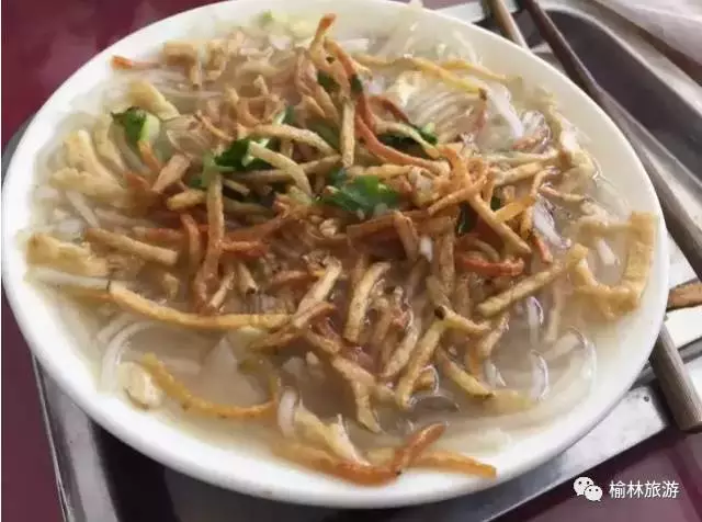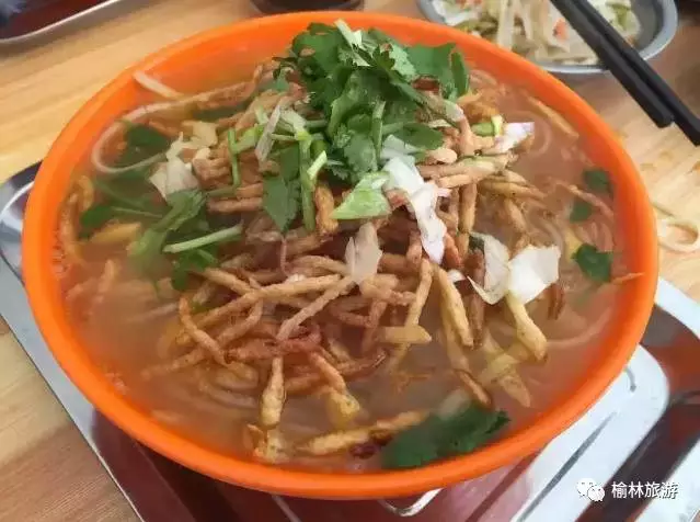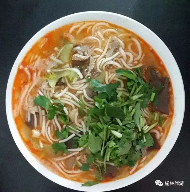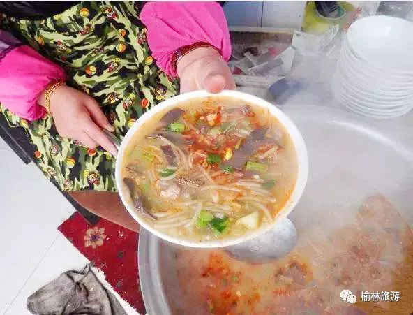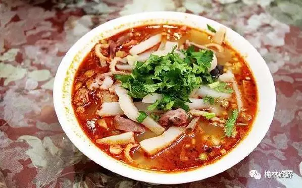 在榆林城区和吴堡佳县等地方的人看来,由羊内脏、粉条、炸土豆条、炸豆腐条等物合成的羊杂碎酸辣兼宜,无腥不腻,汤鲜味美,入口生津,营养丰富,极具特色。