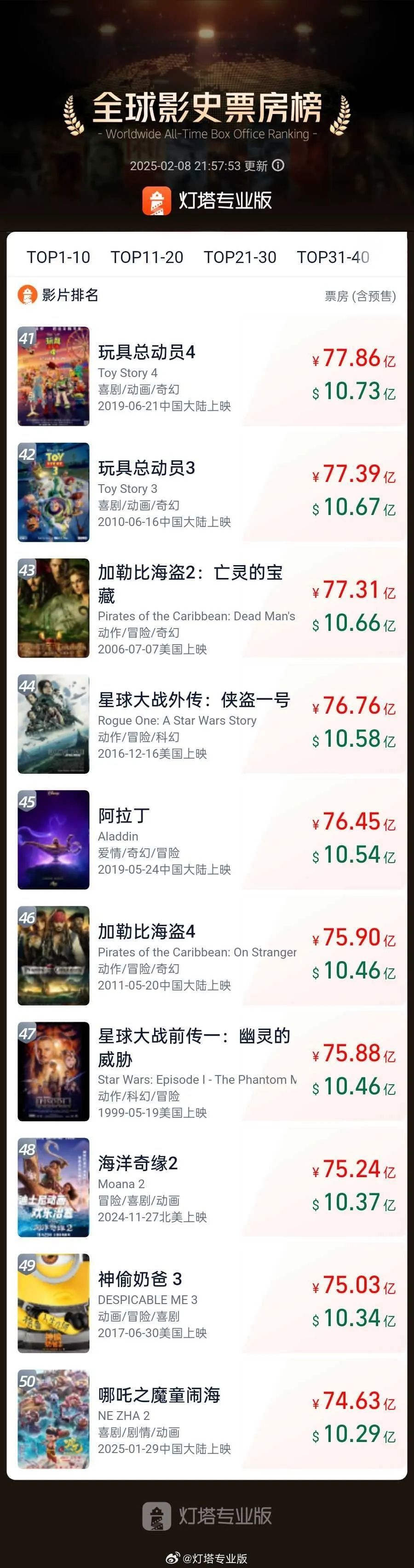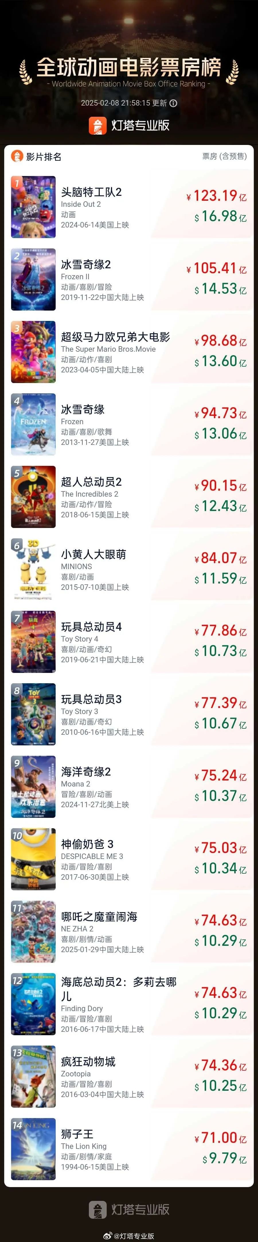 据网络平台数据,《哪吒之魔童闹海》累计票房(含预售)超74.63亿,超《海底总动员2:多莉去哪儿》票房成绩,成为首部进入全球影史票房榜前50的亚洲电影,同时进入全球动画片票房榜前11。