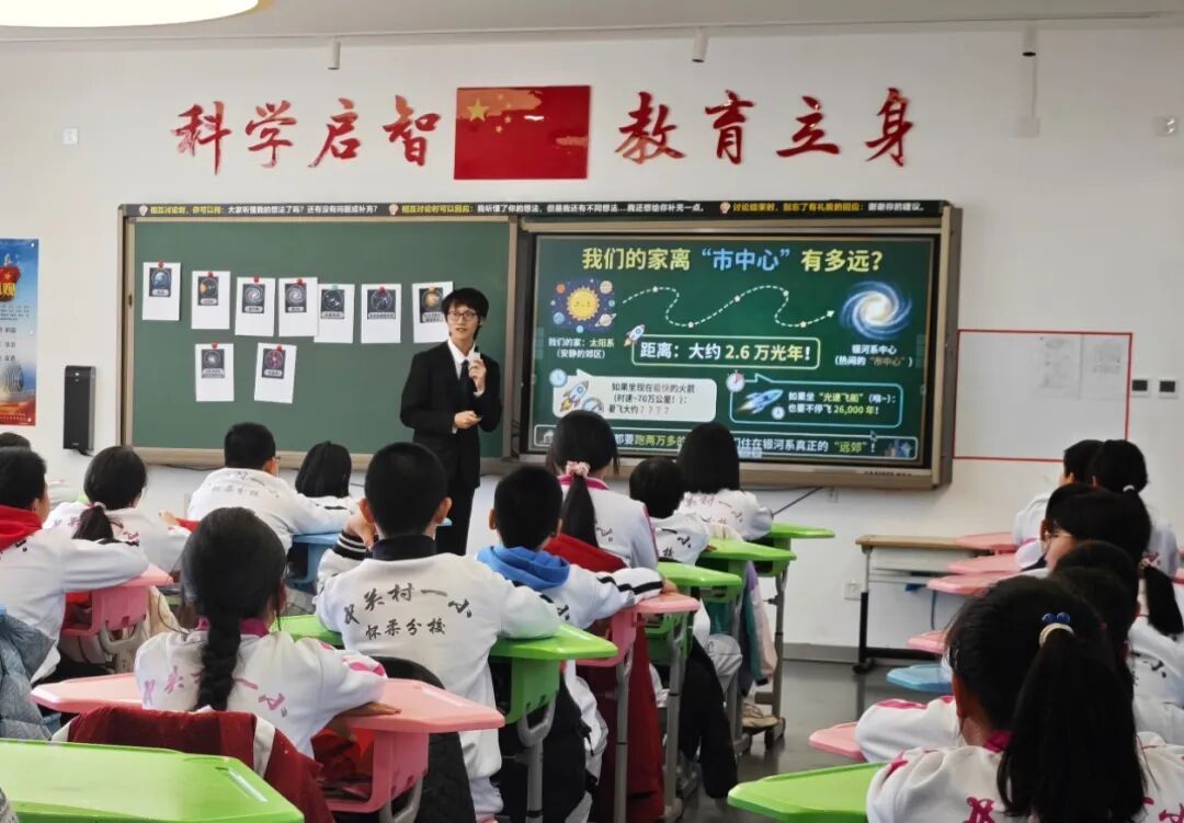 他顺着学生的回答,逐步引导大家探索行星、星系的奥秘。学生们听得目不转睛,不时与同桌交流探讨,在互动中解锁天文知识。