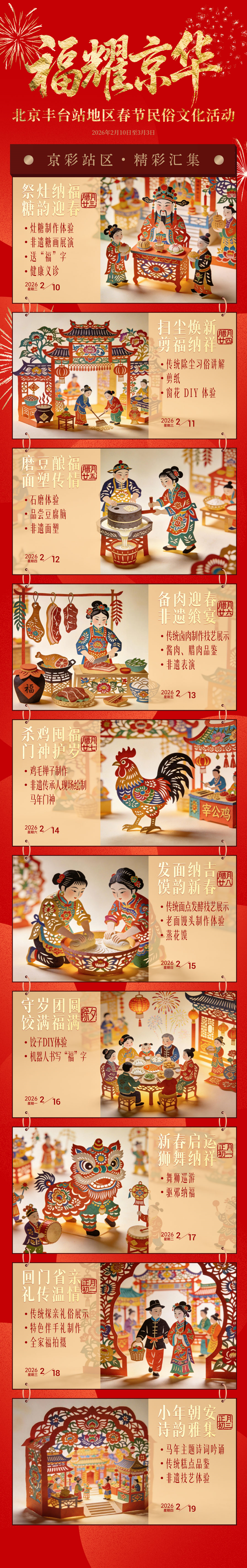 北京丰台站地区新春年味浓!腊月二十三至正月初三,“日历式”年俗活动热闹开启:祭灶糖画、剪纸窗花、石磨豆腐、非遗面塑、舞狮巡游、饺子守岁……传统技艺与机器人写福同台,非遗体验与民乐戏曲共伴。诚邀您与家人来此触摸乡土记忆,亲手制作一份年礼,在红火喜庆中迎接甲辰马年!