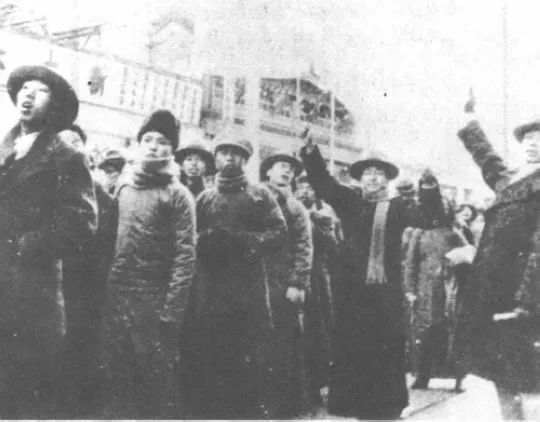 12月9日,城里游行学生振臂高呼“打倒日本帝国主义!”“打倒汉奸卖国贼!”。