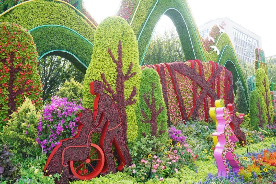东单西南角,“健康中国”花坛以绿道贯穿全民健身运动为场景,配以登山、骑行等户外健身及康养活动,寓意以人民为中心全面推进健康中国建设。花坛顶高8.5米。