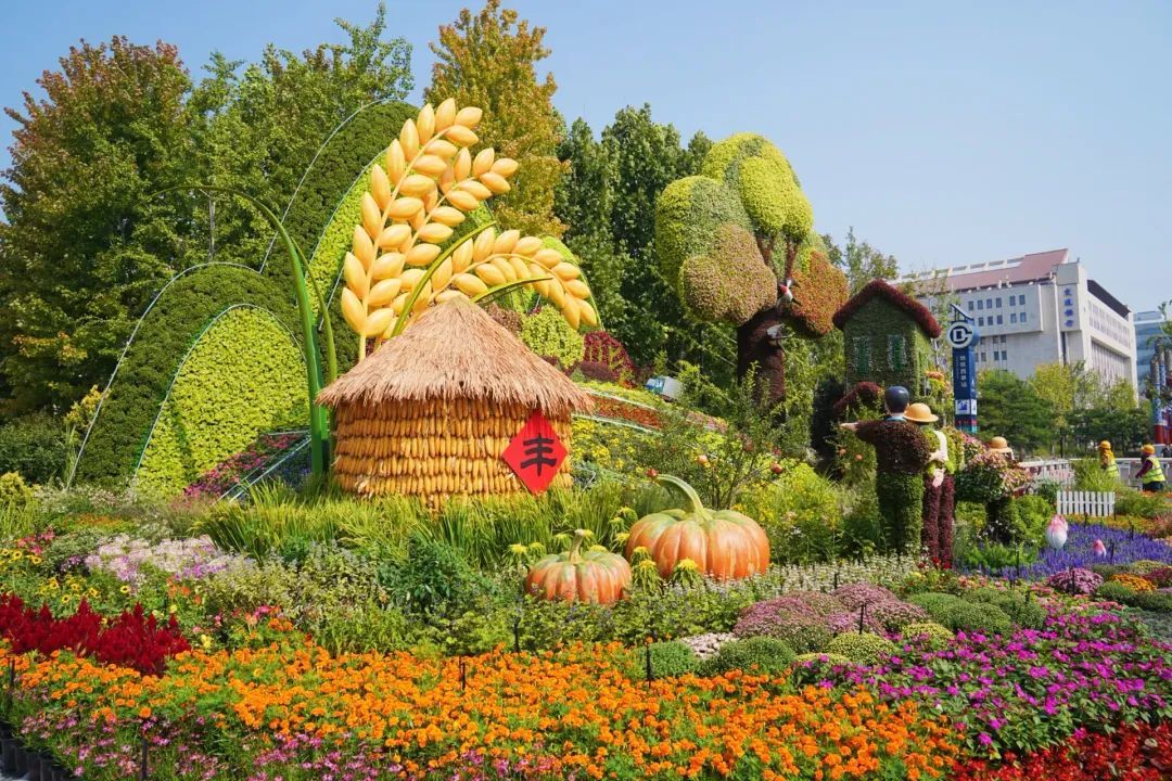 西单东北角,“花园乡村”花坛以新时代花园乡村为场景,配以田野、村庄、粮仓等,体现了乡亲们安居乐业、幸福生活的生动图景。花坛顶高8.5米。