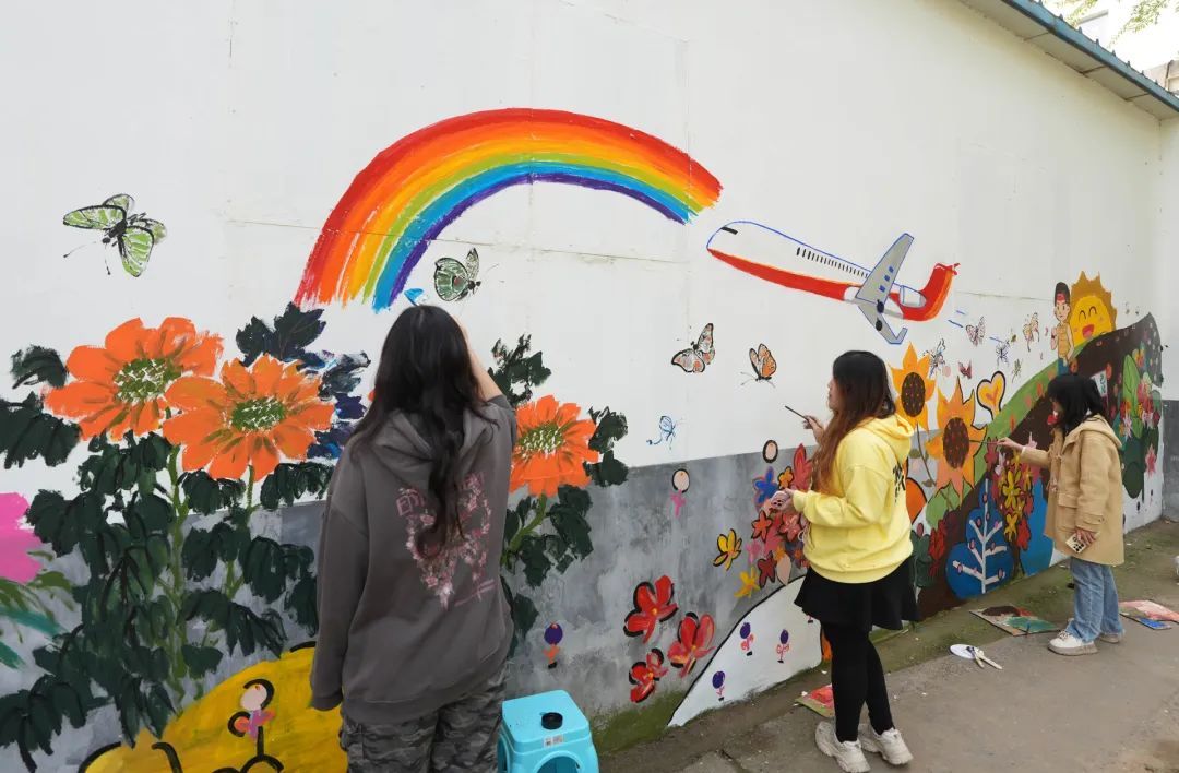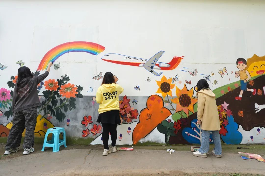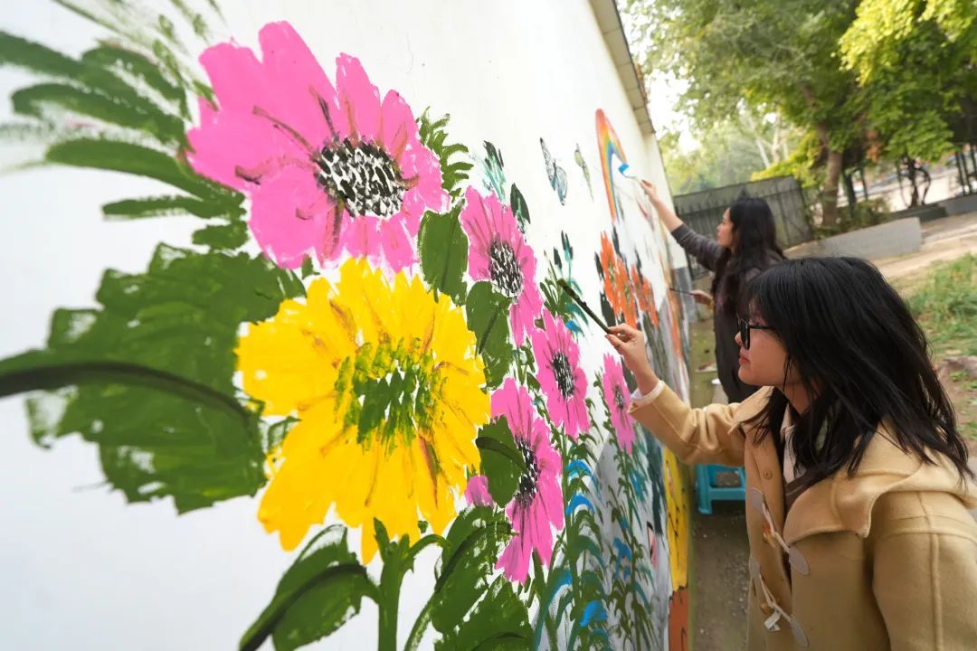 为了帮老墙换新颜,师生们在设计中还花了不少心思。该校美术系主任牛明明带领师生们提前到社区踏勘,围绕社区给出的“绿色生活”主题,设计了多版画稿。“我们发现,旁边就有一家社区幼儿园,所以在墙绘中多用了一些鲜艳的亮色,让孩子们的生活环境更多姿多彩。”在该校国画教师刘阔的笔下,向日葵、蝴蝶、奔跑的孩子等元素栩栩如生,一幅人与自然和谐共处的美好场景跃然纸上。