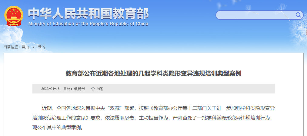 近期,全国各地深入贯彻中央“双减”部署,按照《教育部办公厅等十二部门关于进一步加强学科类隐形变异培训防范治理工作的意见》要求,依法履职尽责、主动担当作为,严肃查处了一批学科类隐形变异违规培训行为,现公布其中的典型案例。