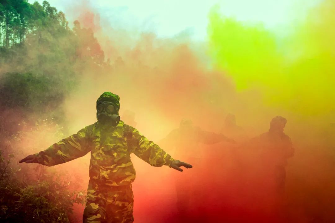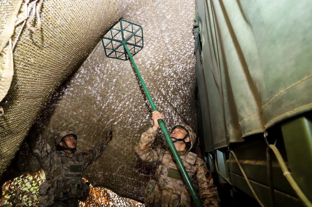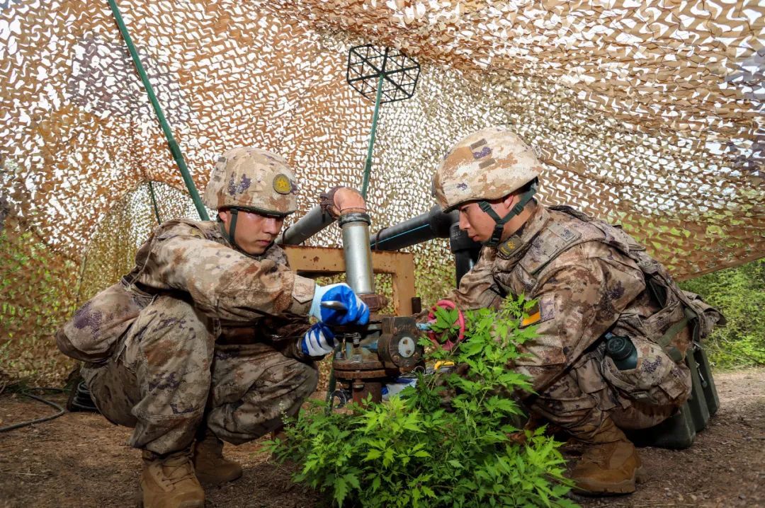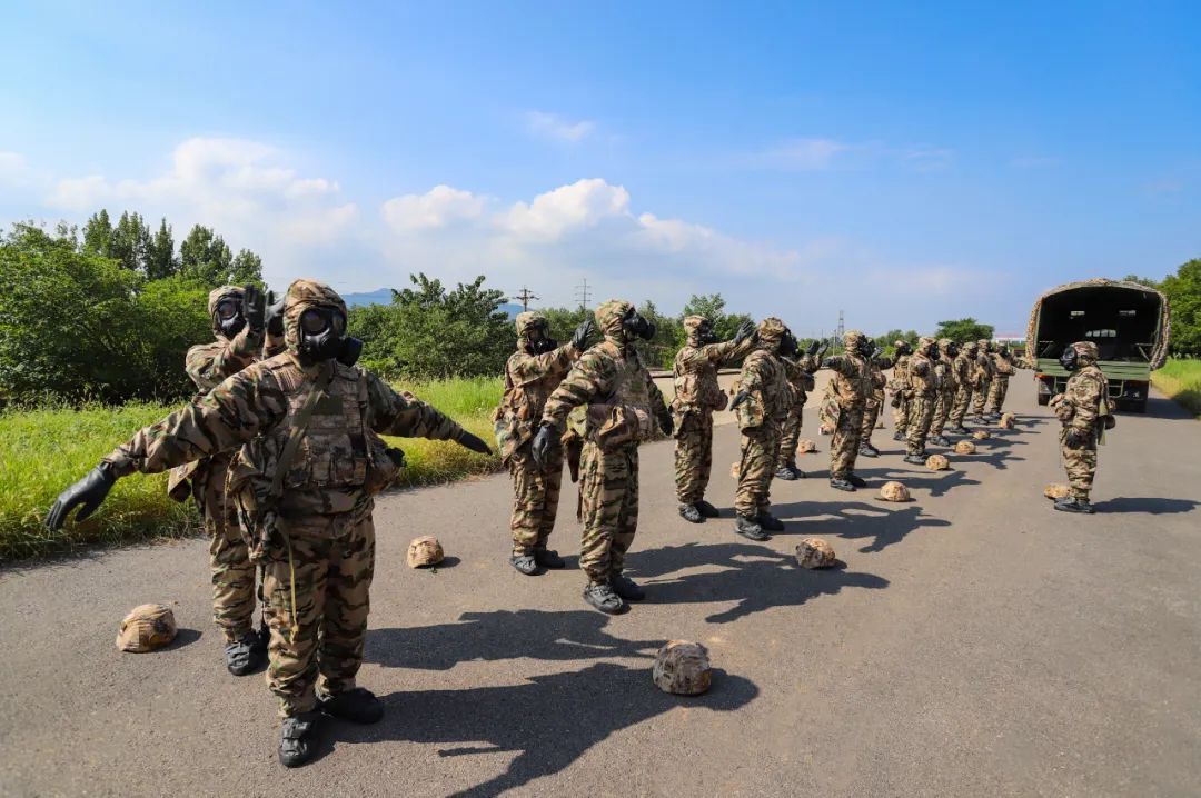 在核生化袭击现场,官兵迅速穿戴防护装具通过沾染地域,相互洗消等处置动作紧密衔接。