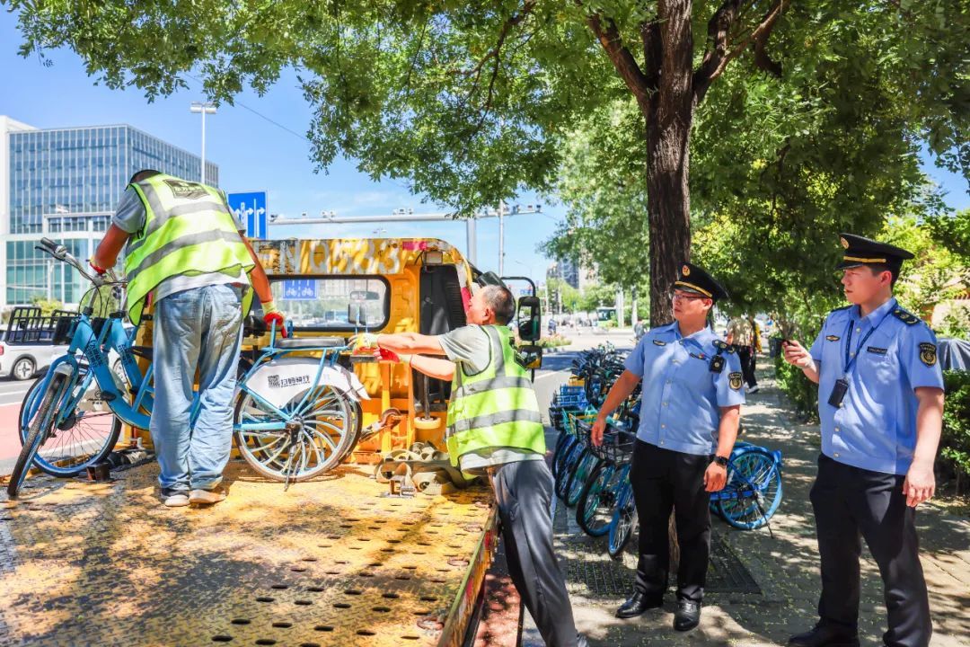 7月17日下午,磁器口地铁站外,北京市交通运输执法总队通过巡查发现两辆违规投放的“亲子单车”,并联系属地部门进行了清理。据统计,7月以来,本市已累计清理违规投放的“亲子单车”800余辆,对10家违规经营主体进行了约谈。