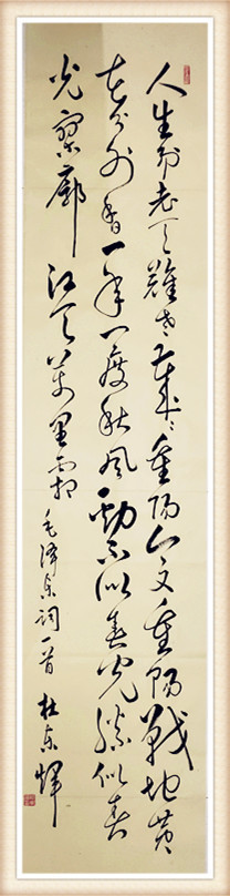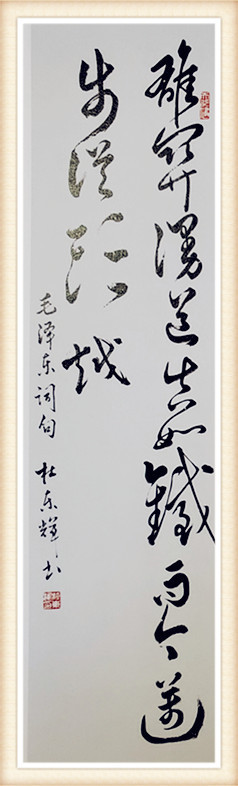 杜东辉,男,生于1973年10月,河北省高碑店市人,职业为医务工作者,工作之暇,颇好笔翰。自幼受父辈影响,志学之年,留心翰墨。临帖二王,怀素,孙过庭《书谱》等,规矩二王,出入旭素。偏爱草书,尤工今草。兼工隶书。