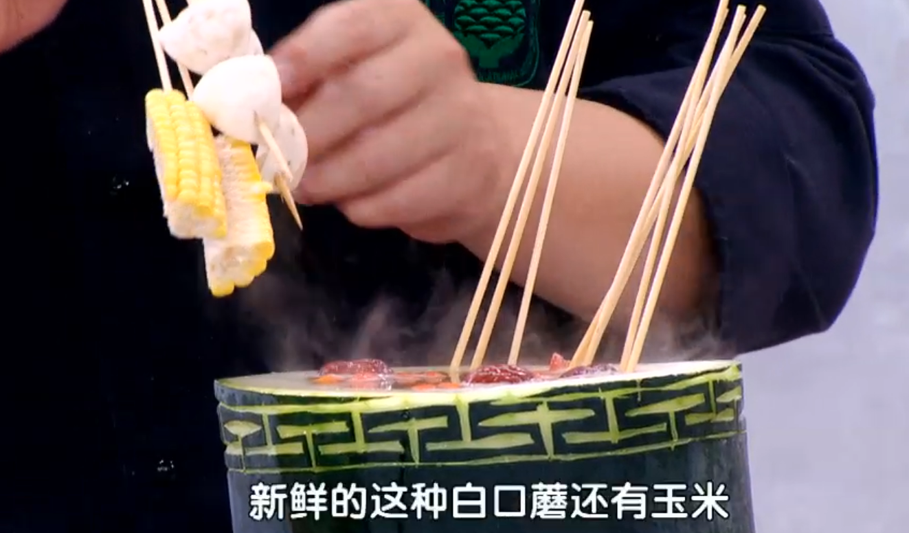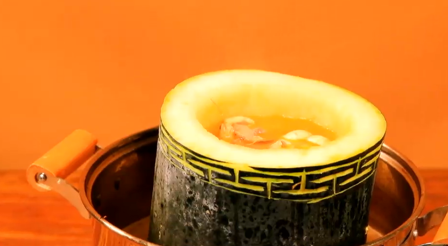 不光老百姓们喜欢,连一些文人墨客也非常青睐。《红楼梦》里有鸡头米,书里叫:鸡头,时鲜货当礼物送,还要装在掐丝的盒子里。今天这道美食的制作也是非常讲究,寓意吉祥的精美雕纹让整道菜更显不凡!透过中空的冬瓜,主持人仿佛打开了另类火锅的大门。
